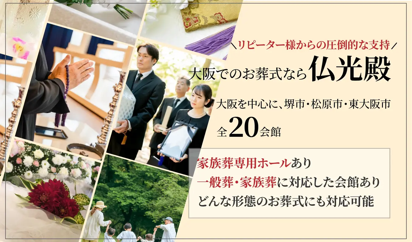 「堺北仏光殿 家族葬ホール」は、堺市北区を中心に大阪府内で多くの葬儀実績を重ねてきた葬儀社です。家族葬に特化した体制を整えており、経験豊富なスタッフがご遺族をサポートしています。