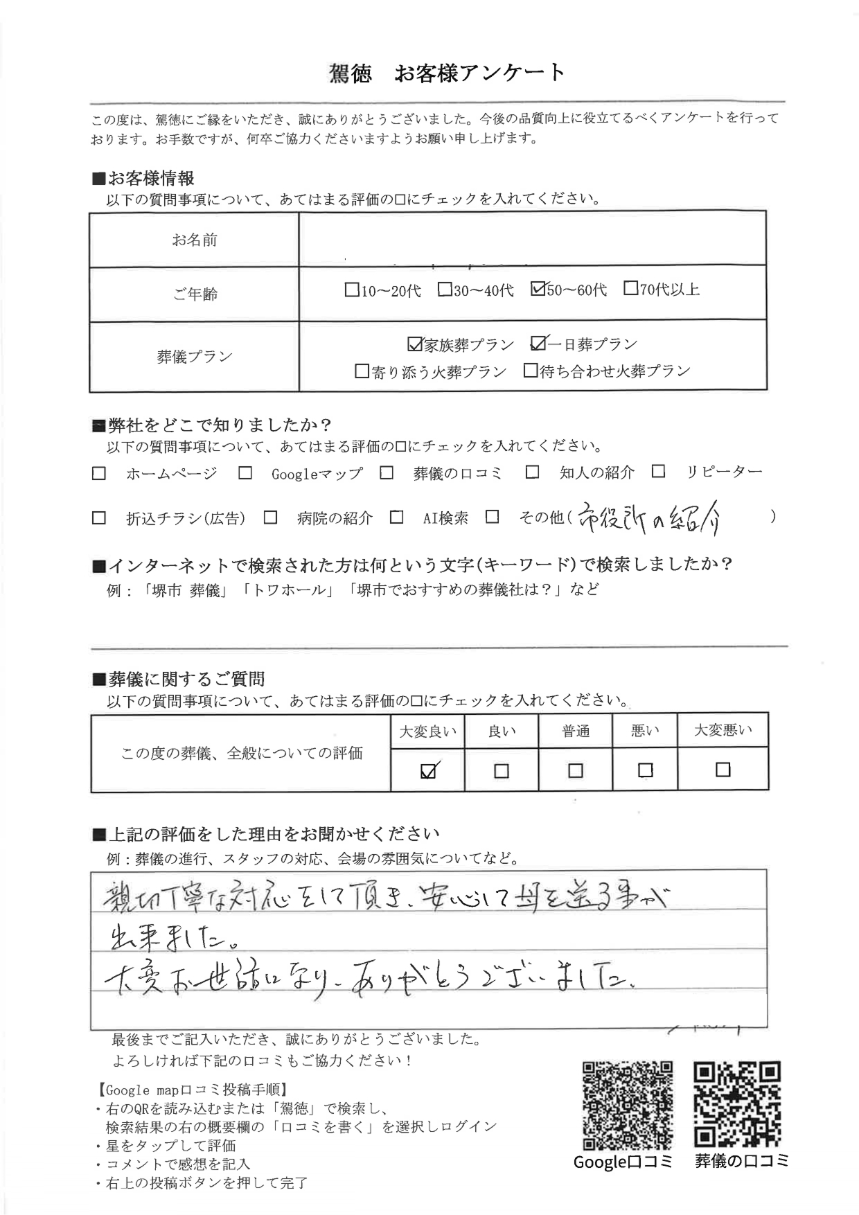 生前に来社いただき相談をさせていただいておりました。その際は特に深刻なご状態ではございませんでしたが、ご高齢という事もあったのと、葬儀の知識などがなく全くわからないので、内容などを聞きに来られた感じでした。それから2年程経過し、入居施設にてお母さまがお亡くなりになられたとご連絡をいただきました。月日も経っていましたので、もう一度ご希望などをお尋ねさせていただき、葬儀の内容を打ち合わせさせていただきました。ご家族様だけでお通夜式はされずに葬儀式のみを行う形となり、葬儀前日には古式湯灌(清拭)にて故人様の体を綺麗にさせていただき、お化粧を施しました。ご家族様にはとてもご好評いただきました。