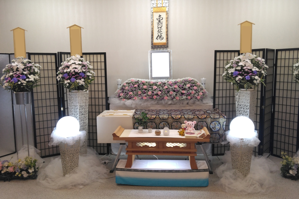 | 葬儀プラン費用 | プラン料金:363,000円 花別れ葬:22,000円 湯灌の儀:55,000円 棺カバー:2,200円 ドライアイス追加分(オプション):11,000円 火葬料金:20,000円 資料請求割引:22,000円 計:341,200円 |