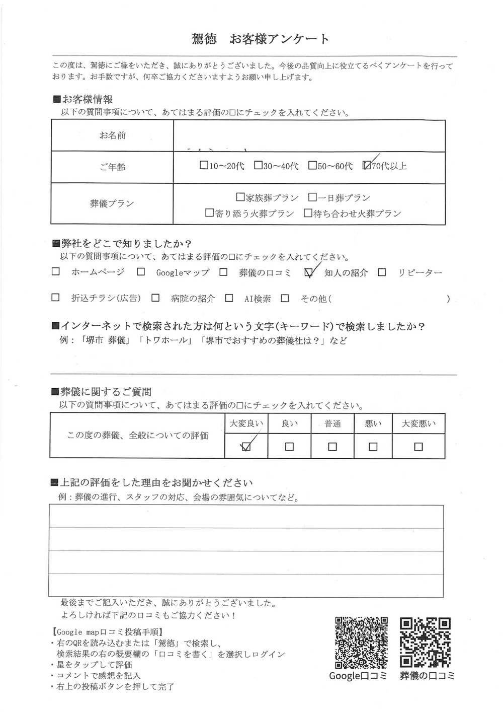 弊社配布のチラシを見てご依頼をいただきました。奥様がご自宅でお亡くなりになられ、警察へ搬送後に検視を行うとのご連絡でしたので、翌日に弊社でお迎えに行かせてもらいました。検視後は病院等で行う死後処置(エンゼルケア)はなく、お体に着衣もない状態での引き渡しとなりますので、弊社でお預かり後に、お化粧や着せ替え等の処置を丁寧にさせていただきました。お葬儀のプランにおいてはすごく悩まれておりましたが、ご相談の結果1日葬で行うこととなりました。ご寺院様も弊社でご紹介をさせていただきました。その際に戒名の字に関してご希望がございましたので、その事もご寺院様にお伝えさせていただきました。授けていただいた戒名は、とても喜んでおられました。葬儀はご家族と近親者のみで執り行い、できる限りお別れの時間をおとりさせていただきました。慌てる事なく落ちついた時間の中で行うことができました。
